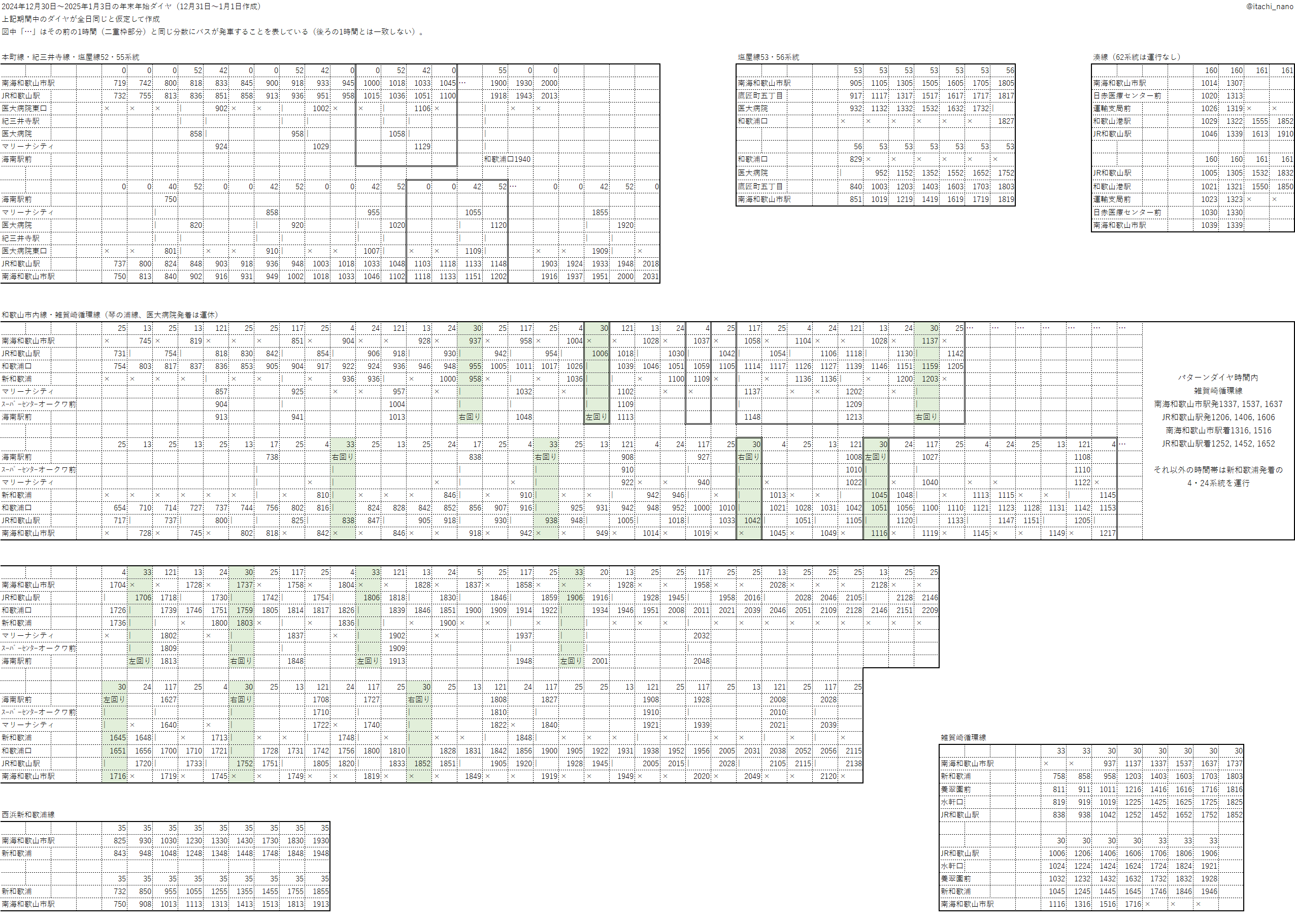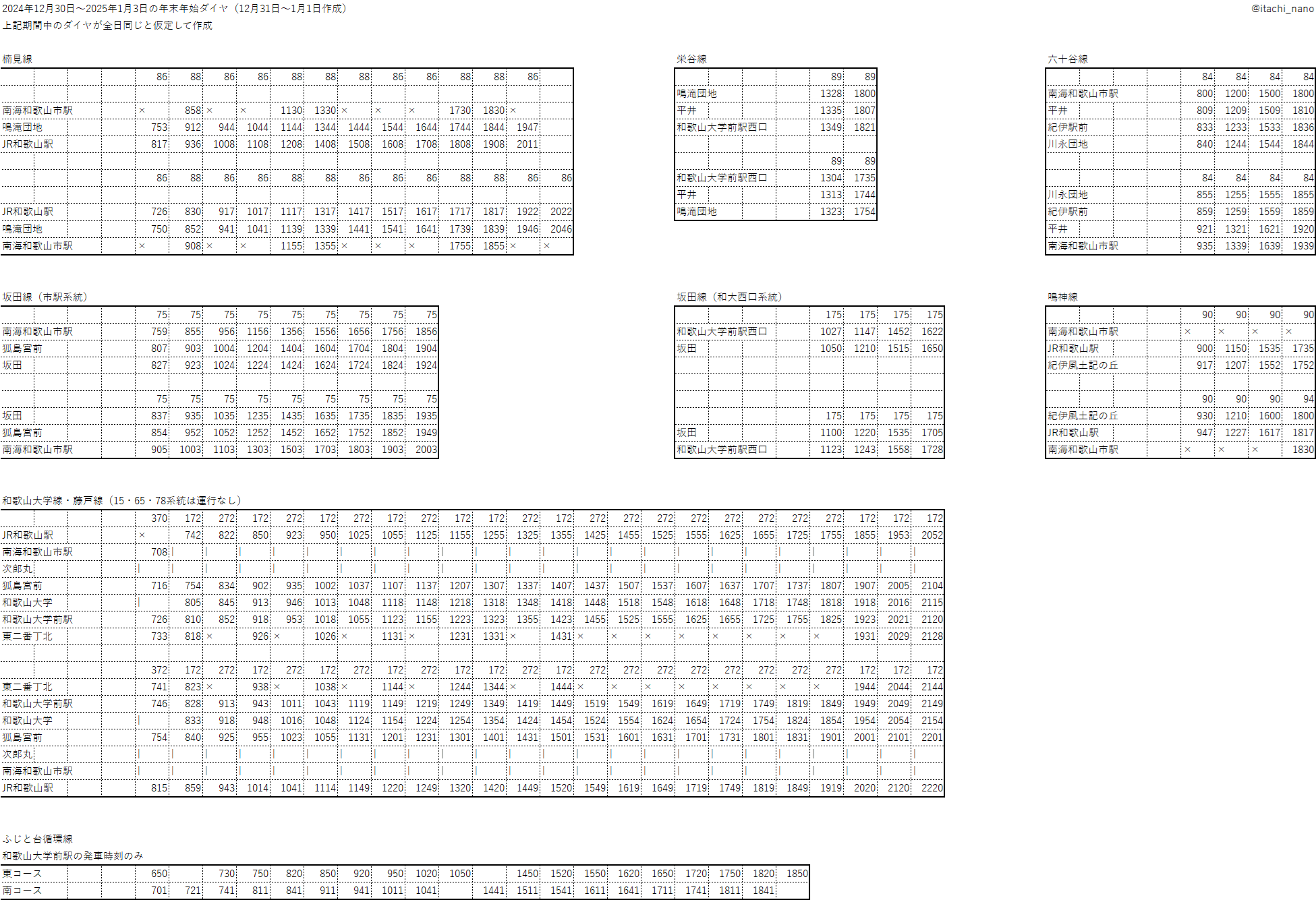 2026年1月9日 / 最終更新日時 : 2026年1月24日 匿名 未分類 【データ集】和歌山バス2024〜2025年年末年始ダイヤ X(Twitter)より再掲。 途中の発車時刻および終点の到着時刻は一部省略し、「〇」と記載している。